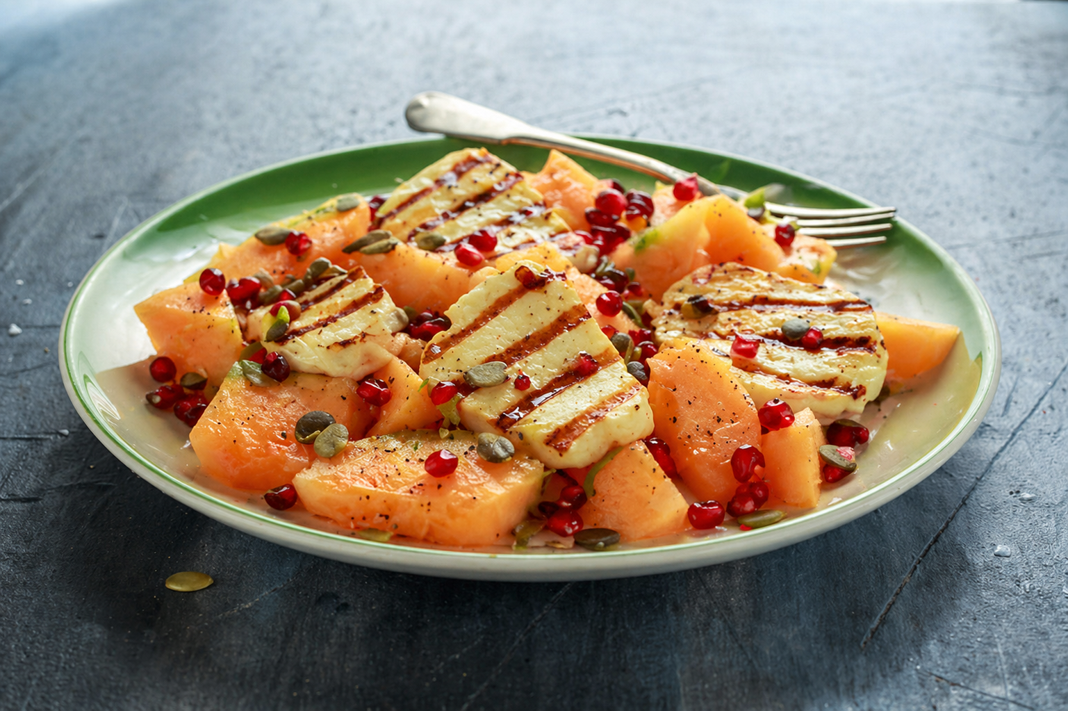 - Dispose le melon, ajoute le halloumi chaud par-dessus, puis les graines et la grenade.