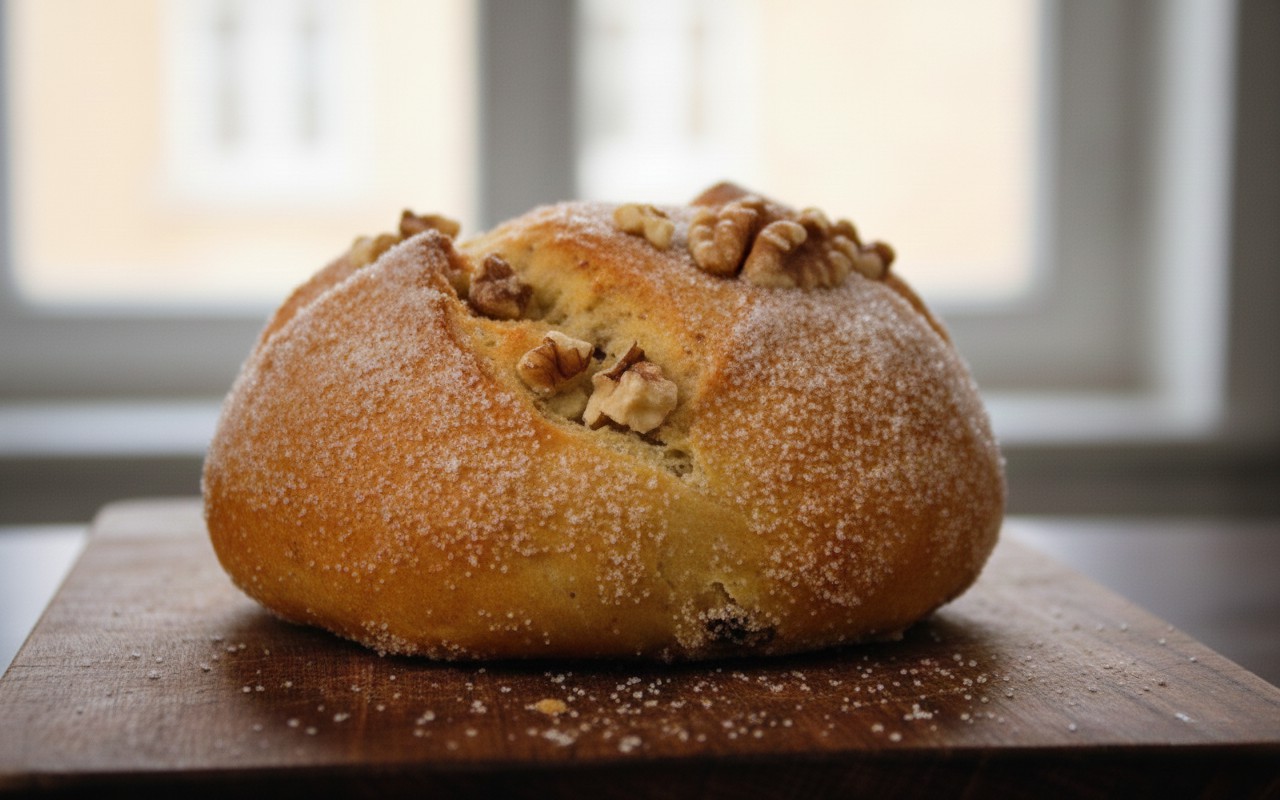 Ce Pain du Solstice d’Hiver est un hommage simple et réconfortant à la saison froide et au cycle de la nature. Rustique et nourrissant, il est enrichi de généreux morceaux de noix concassées, symbolisant les réserves et l’énergie conservées pour affronter l’hiver. Avec sa croûte épaisse et sa mie dense et aérée, subtilement sucrée par une touche de miel, il est le parfait complément de votre Rôti de Yule. Servez-le encore tiède, idéalement tartiné d’un peu de beurre salé, pour un moment de partage et de chaleur à votre table.
