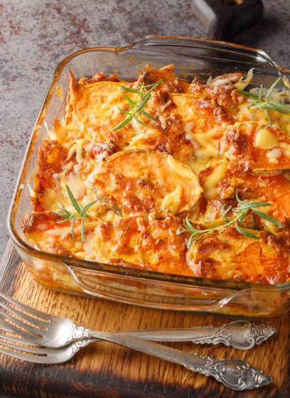 Un gratin potiron et pomme de terre automnal généreux, qui marie la douceur du potiron au fondant des pommes de terre et à la gourmandise …