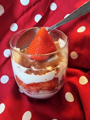 - Montez vos verrines en mettant au fond de la chantilly puis des fraises coupées en morceaux, puis des boudoirs imbibés, une autre couche de crème et pour finir un peu de cacao.